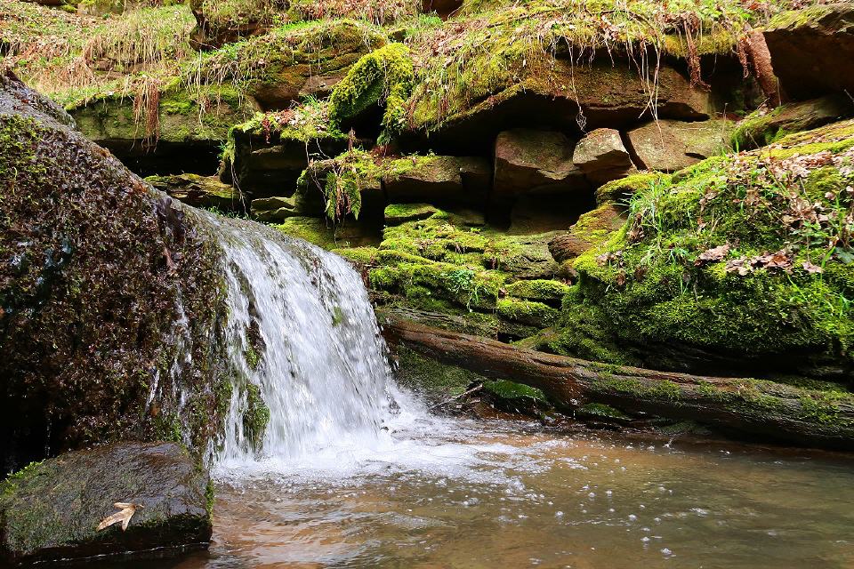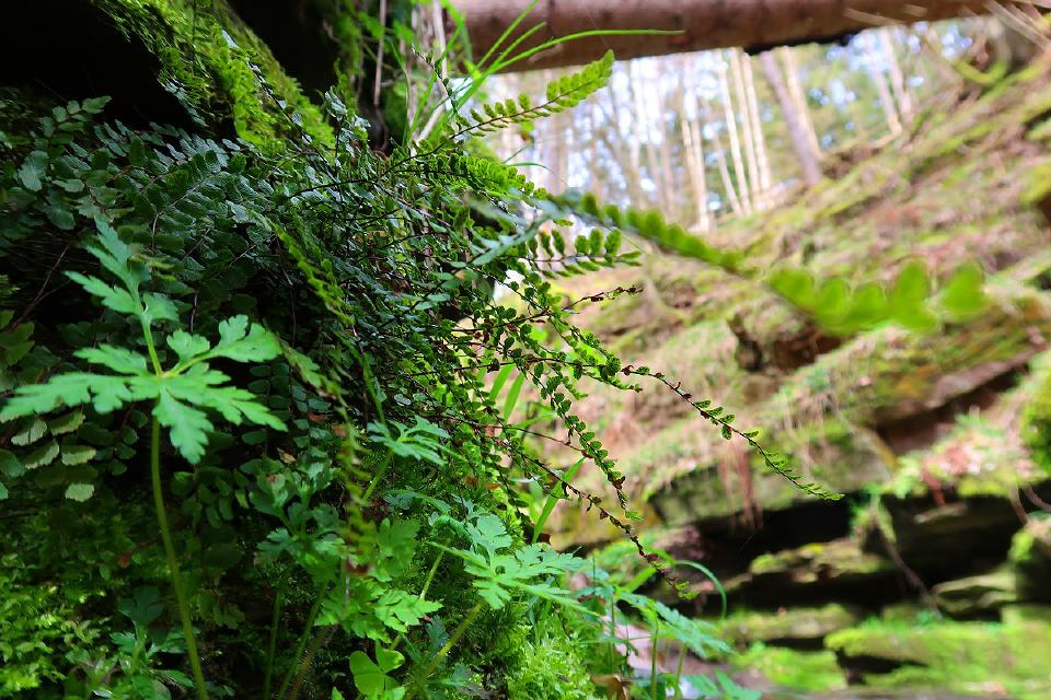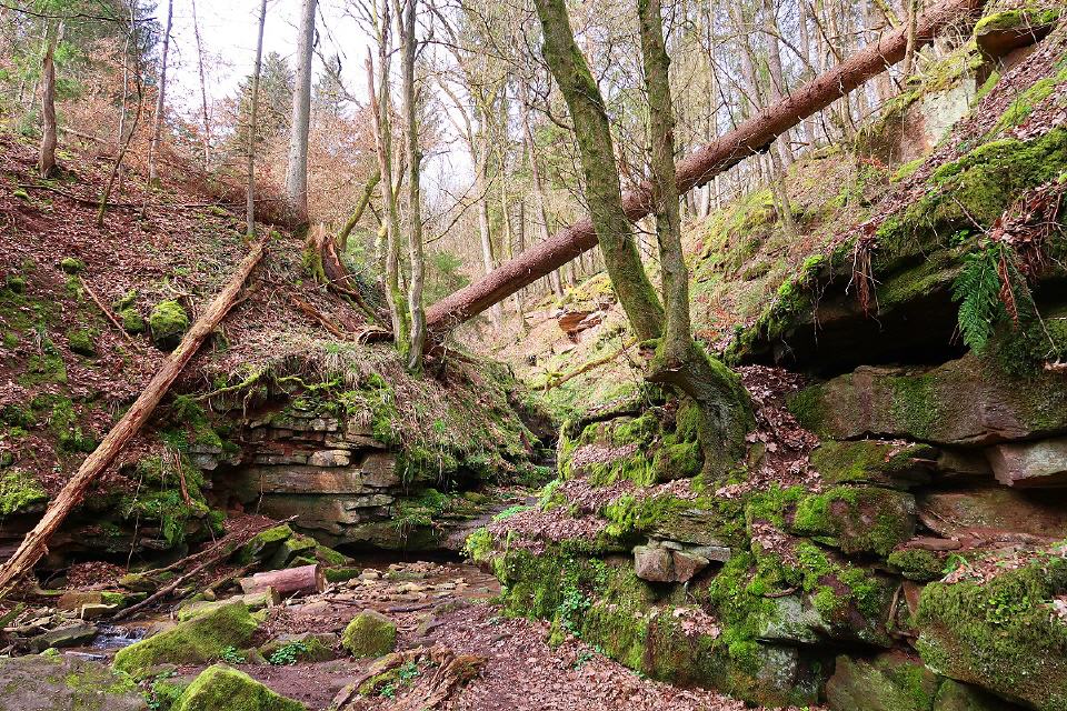 Ein Stück weiter führt eine Brücke von einer Talseite zur anderen. Hier steht harter Geröllsandstein an. Für den Bach ist es sehr mühevoll, sich in ihn einzutiefen. Unterhalb davon, im weicheren Badischen Bausandstein, hat der Bach es deutlich leichter: Hier konnte er ein breiteres Tal in die Steine hinein graben. Viele Pflanzen fühlen sich hier wohl - es sind vor allem verschiedene Farnarten, die an den Felsen wachsen. Sonnenstrahlen erreichen die Schlucht nur spärlich, dazu kommt eine hohe Luftfeuchtigkeit auch wegen der vielen Quellen und des Baches. Es bilden sich feuchtkühle Mikroklimate. Sie sind ideal zum Beispiel für den Braunstieligen Streifenfarn (Asplenium trichomanes), der sich vor allem in Gesteinsklüften wohlfühlt. Dort sammelt sich ein wenig Humus, der Nährstoffe und Wasser festhält. Der sich einschneidende Bach stößt immer wieder auf besonders harte Geröllsandsteinbänke. An diesen Widerständen bilden sich kleine Wasserfälle und Stromschnellen.