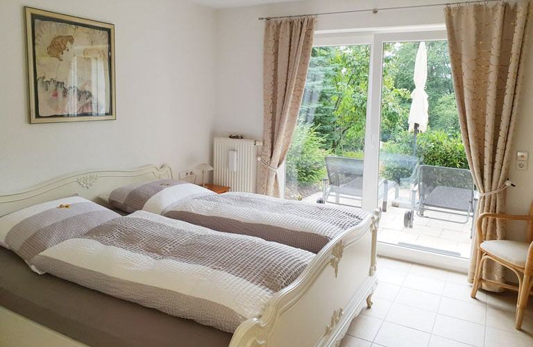 Komplett eingerichtete Küche mit Spül- und Waschmaschine samt Trockner. Die Wohnung verfügt über einen separaten Eingang, große überdachte Terrasse mit Liegewiese und Parkplatz. Wohnzimmer als Wintergarten, extra Schlafgelegenheit, Telefon, W-LAN, Sat-TV, Getränkeservice auf Wunsch, Bett- und Tischwäsche vorhanden sowie Solarium. Die UG-Wohnung ist behindertengerecht (barrierefrei) gestaltet. Hier finden sich auch Rollstuhlfahrer problemlos zurecht. Zeitlos, gemütlich und mit allem Komfort sind die Ferienwohnungen ausgestattet, so dass sie sich wie zu Hause fühlen werden. Wohn- und Schlafzimmer sowie die Küche sind getrennt. Die Badezimmer genügen höchsten Ansprüchen. Sollte es Ihnen an irgend etwas fehlen, dann dürfen Sie sich jederzeit an uns wenden. Wir sprechen auch englisch.