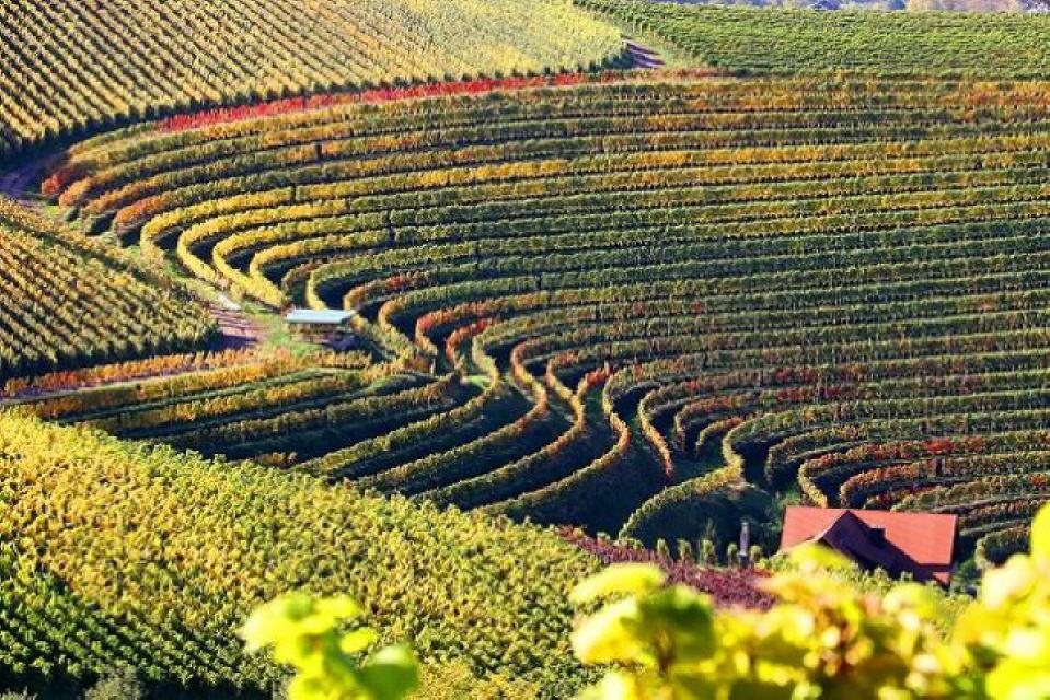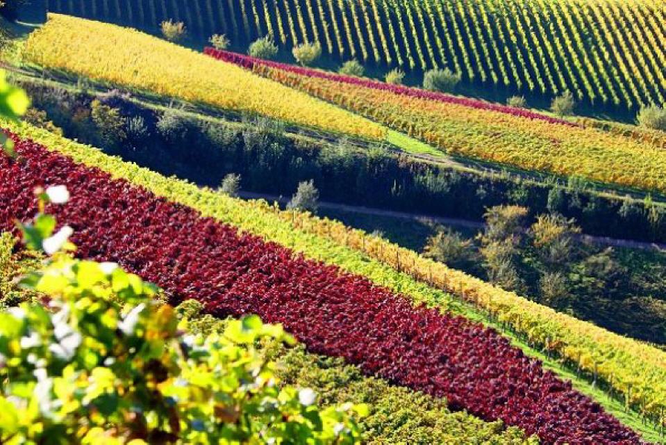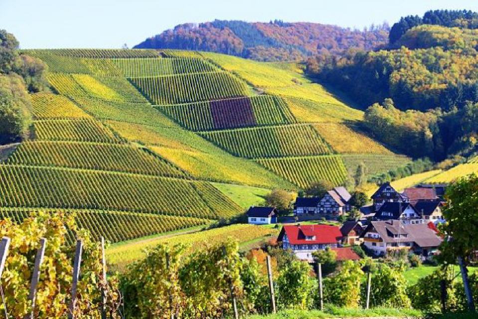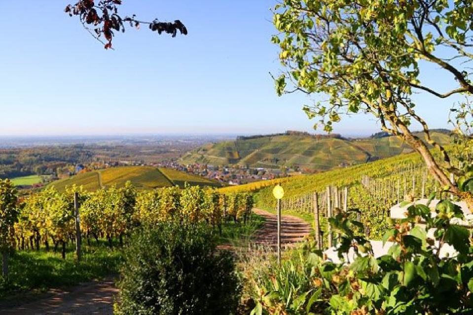 Weiter geht's bergab durch die Weinberge, vorbei an den Hofgütern im hinteren Lautenbach talauswärts zur „Pia-Hütte“. Kurz vor diesem idyllischen Rastplatz biegen vom breiten Schotterweg nach links ab. Über kleine Serpentinen erfolgt der Abstieg zu den beiden Weinbaubetrieben „Vollmer“ und „Huber“, die in direkter Nachbarschaft im Lautenbachtal liegen. Ein kleiner Zwischenstopp, um ein frisches Gläschen Durbacher Wein zu verkosten ist hier natürlich Pflicht! Die kleine Erfrischung können wir auch gebrauchen, denn es gilt, gleich auf der gegenüberliegenden Talseite im Lautenbach noch einmal einen Anstieg mit ca. 100 Höhenmetern zu bewältigen. Auch hier empfiehlt sich am höchsten Punkt des Anstiegs wieder inne zu halten, um das Panorama vor sich zu genießen.