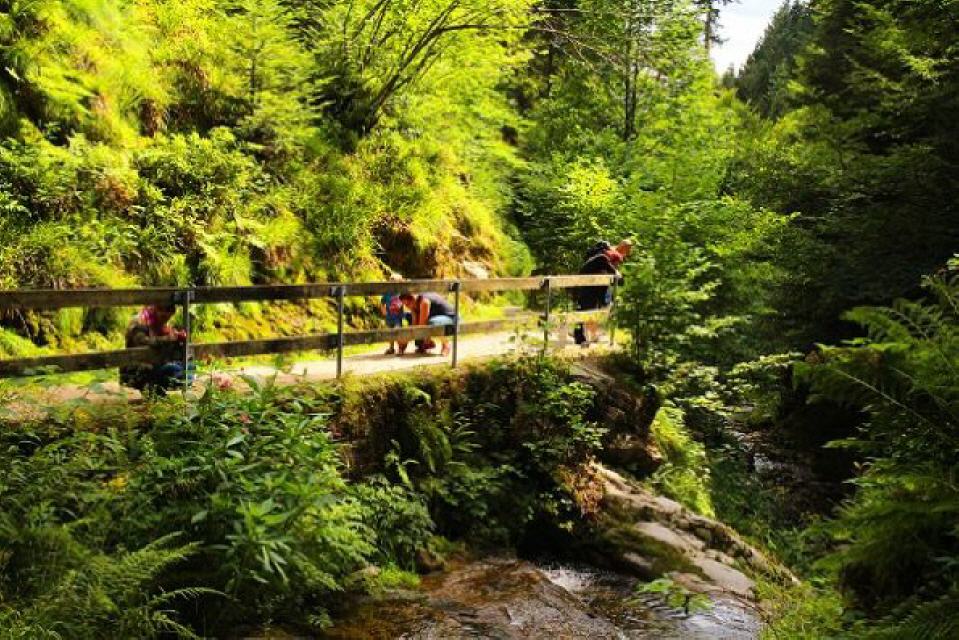 Start ist beim Parkplatz am unteren Ende der Wasserfälle. Hier befindet sich auch das Tor zum Nationalpark Schwarzwald. Sie durchsteigen nun die wildromantischen Wasserfälle, die bereits im 19. Jahrhundert mit Leitern erschlossen wurden. Zu Beginn des 20. Jahrhunderts wurde die jetzige Streckenführung mit Treppen erschlossen. Bei Hochwasser bieten diese Wasserfälle ein ganz besonders reizvolles Naturschauspiel, bei dem die Besucher an manchen Stellen auch berieselt werden. Am oberen Ausstieg folgen Sie dem Forstweg und erreichen das Ehrenmal des Schwarzwaldvereins. Von dort wandern Sie weiter an den Standort "Am Zierteich".