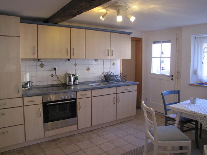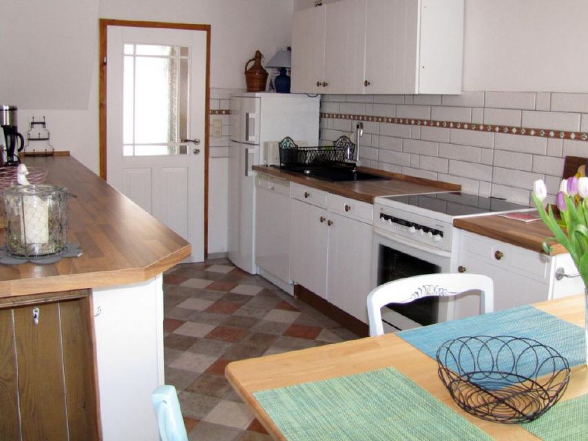 Voll ausgestattete Küche mit Elektroherd (Cerankochfeld), Backofen, Dunstabzug, Kühlschrank, Toaster, Kaffeemaschine, Wasserkocher, Spülmaschine, ausreichend Geschirr und Besteck für 4 Personen und gemütlichem Essbereich.