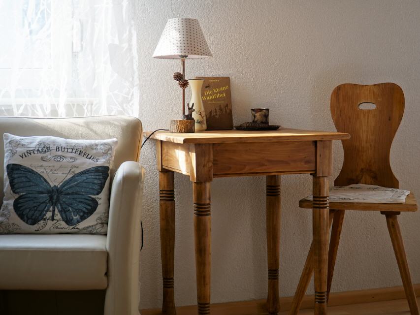 Die Wohnung ist sehr hell und hat großzügige Räume, die Wohn- und Schlafräume sind ausgestattet mit Parkettboden, bzw. Vinyl-Korkböden in Holzoptik, Küche, WC-Dusche und Badezimmer mit hochwertigen Fliesen. Auch diese Wohnung ist in einer geschmackvollen Mischung aus alten restaurierten und neuen Möbeln im Vintage-Stil eingerichtet.