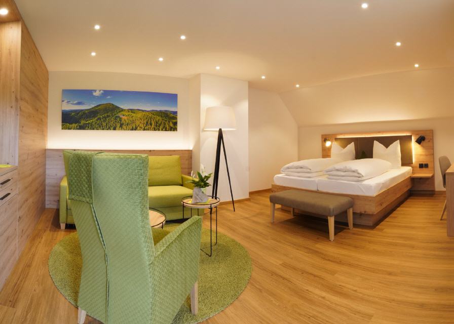 62 qm Wohnfläche. Tauchen Sie ein in eine Welt voller Gemütlichkeit und Erholung, die Ihren Aufenthalt zu einem unvergesslichen Erlebnis machen wird. Die Suite erstreckt sich großzügig über 62 Quadratmeter und bietet Ihnen Raum zum Entspannen und Durchatmen. Hier finden Sie zwei separate Schlafzimmer, liebevoll eingerichtet mit komfortablen Doppelbetten. Jedes der Schlafzimmer lädt Sie ein, in eine Welt der Träume und Ruhe einzutauchen. Nach einem ereignisreichen Tag im Schwarzwald oder bei einem Ausflug ins nahgelegene Elsaß können Sie hier die Hektik des Alltags hinter sich lassen und neue Energie tanken.